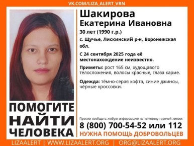 В Воронежской области ищут 30-летнюю Екатерину Шакирову. По информации поискового отряда «ЛизаАлерт», её местонахождение неизвестно с 24-го сентября.