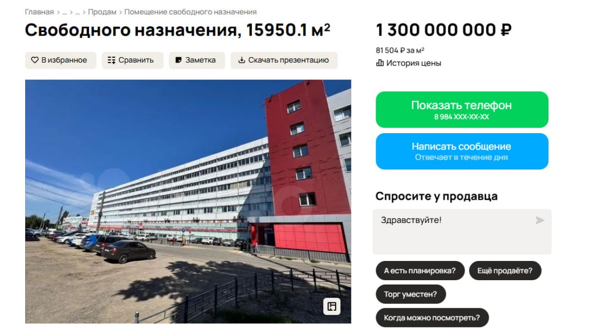 В Воронеже на продажу выставили имущественный комплекс. Согласно информации из объявления с сайта «Авито», его стоимость составляет 1,3 млрд рублей.