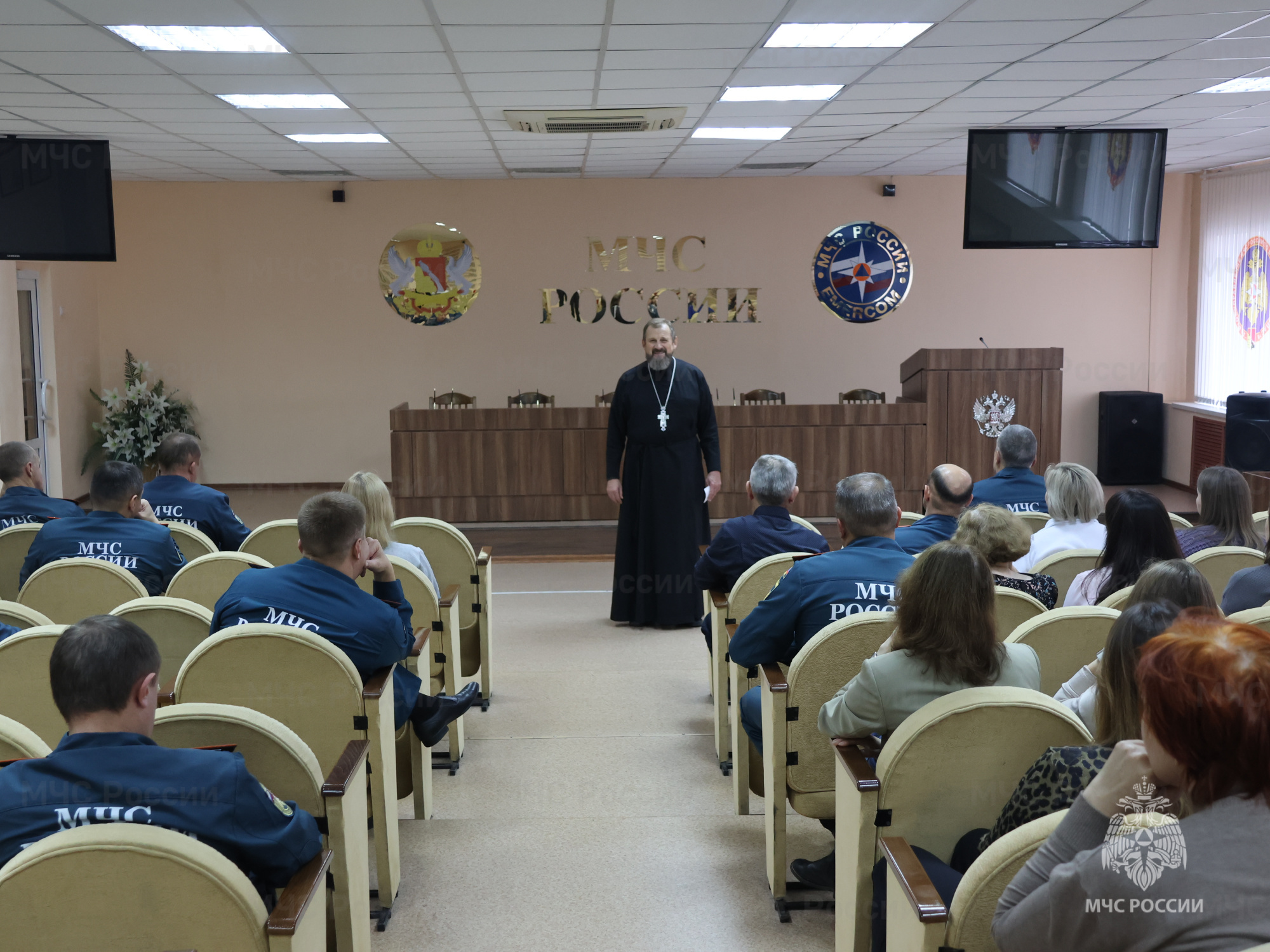 22 октября в актовом зале Главного управления МЧС России по Воронежской области прошла встреча личного состава с представителем Воронежской и Лискинской Епархии, иереем Олегом Решетченко.