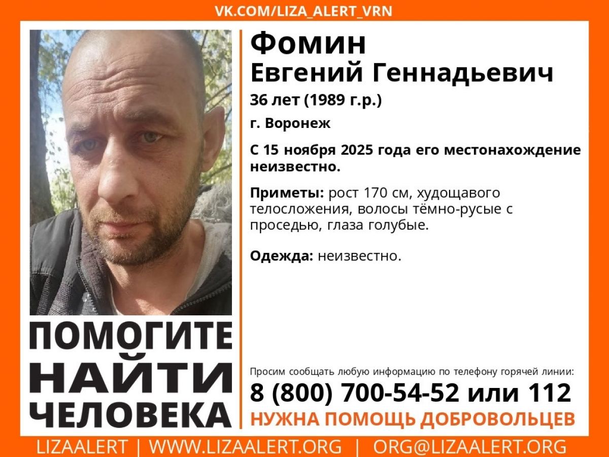 Волонтёры ПСО «Лиза Алерт» объявили о начале поисков пропавшего в Воронеже 36-летнего Фомина Евгения Геннадьевича. С субботы, 15 ноября его местонахождение неизвестно.
