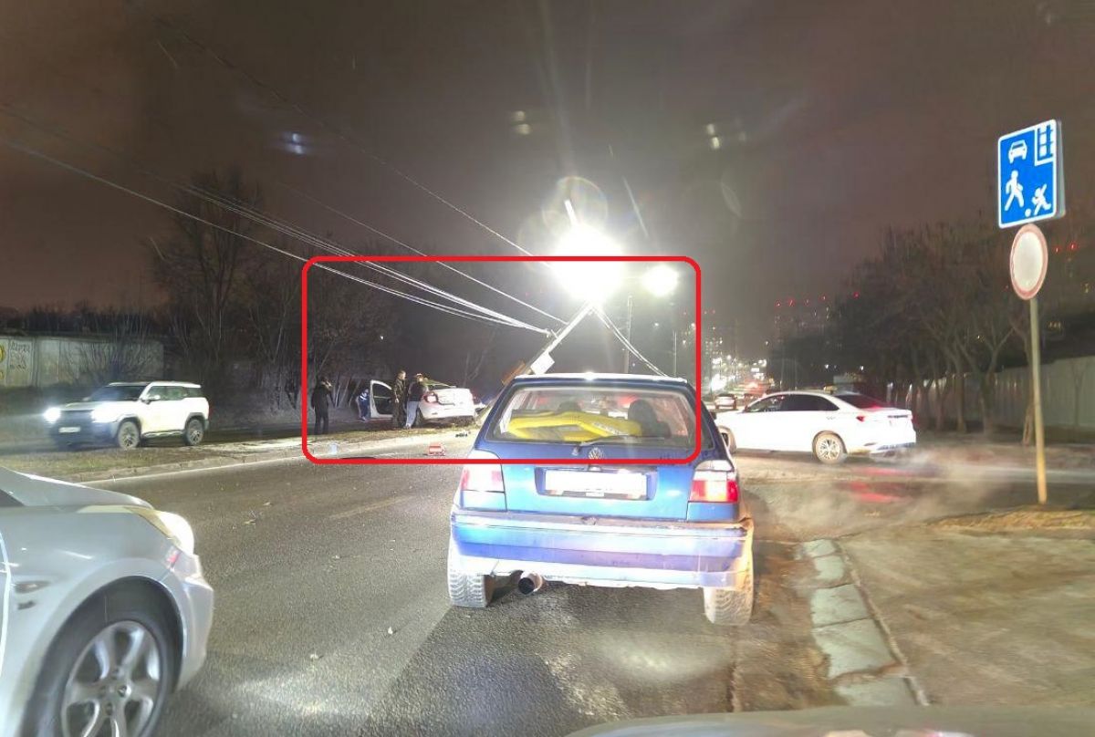 Легковушка не смогла разъехаться с фонарным столбом. Опора уличного освещения не устояла от удара и рухнула на дорогу. Автомобиль получил механические повреждения.
