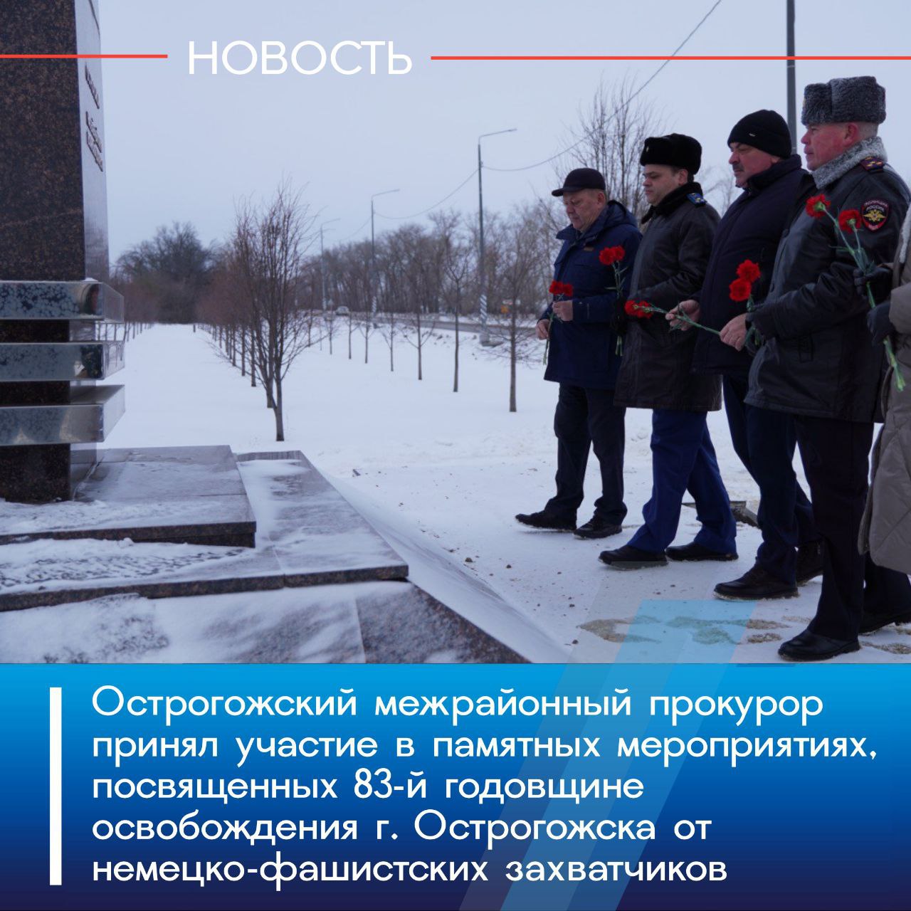 Сегодня, 20 января 2026 года, Острогожский межрайонный прокурор Андрей Новиков принял участие в памятных мероприятиях, посвященных 83-й годовщине освобождения города Острогожска от немецко-фашистских захватчиков.