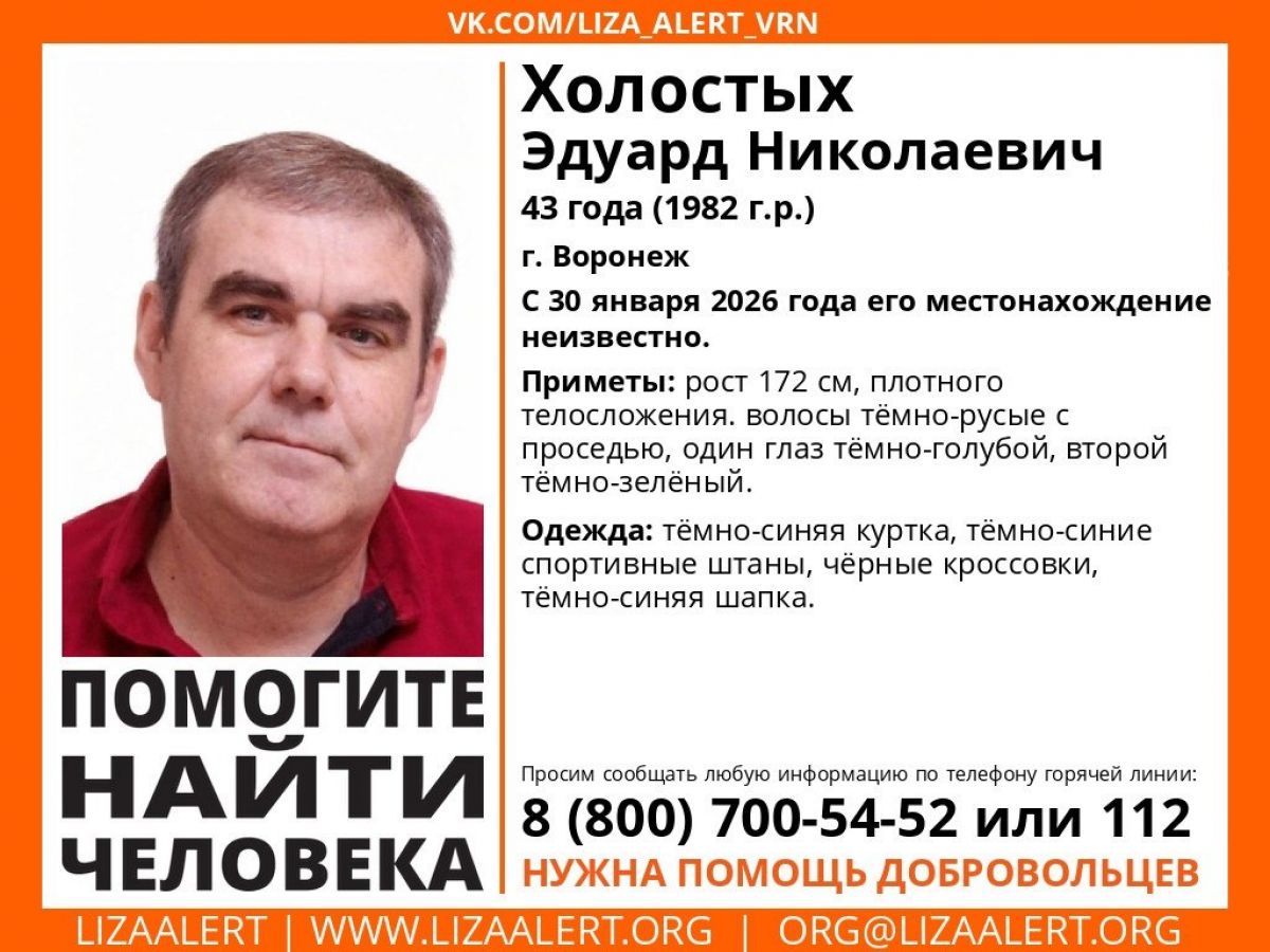 Волонтёры ПСО «Лиза Алерт» объявили о начале поисков пропавшего в Воронеже 43-летнего Холостых Эдуарда Николаевича. С пятницы, 30 января, его местонахождение неизвестно.