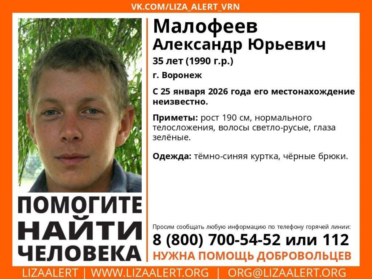 Добровольцы поисково-спасательного отряда «ЛизаАлерт» объявили срочный розыск 35-летнего жителя Воронежа Александра Юрьевича Малофеева. О местонахождении мужчины нет никакой информации с 25 января 2026 года.