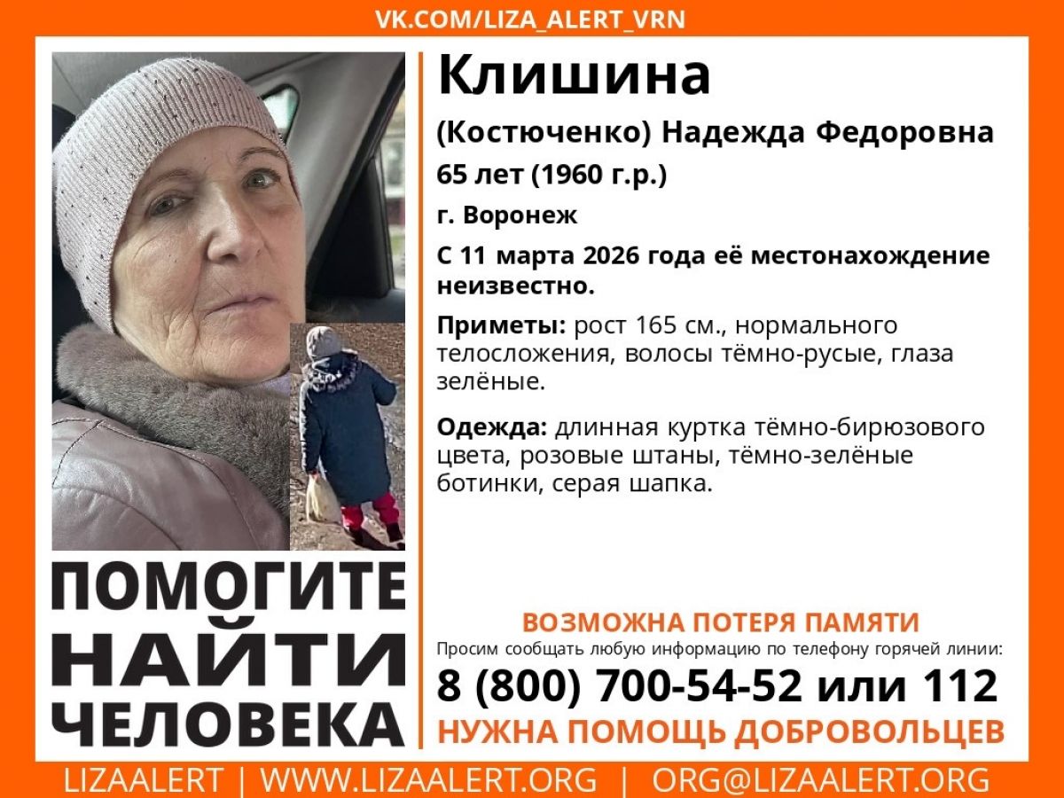 К поискам подключились добровольцы поисково-спасательного отряда «ЛизаАлерт». Координаторы обращаются ко всем, кто обладает любой информацией о местонахождении Клишиной Надежде Федоровне, с просьбой немедленно сообщить об этом.