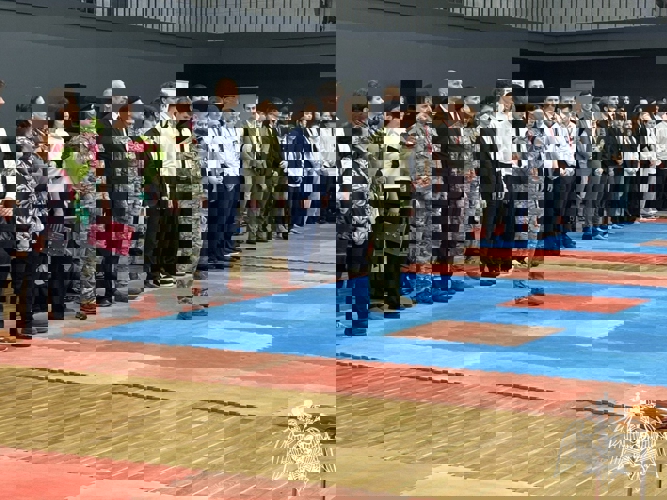 Спортсмены почтили минутой молчания сотрудников отряда, родственникам погибших вручили цветы.