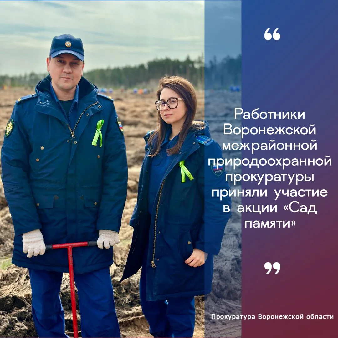 Работники Воронежской межрайонной природоохранной прокуратуры приняли участие в международной акции «Сад памяти», которая проводится во всех субъектах Российской Федерации с целью ежегодного создания новых лесных насаждений и формирования в обществе бережного отношения к лесам.