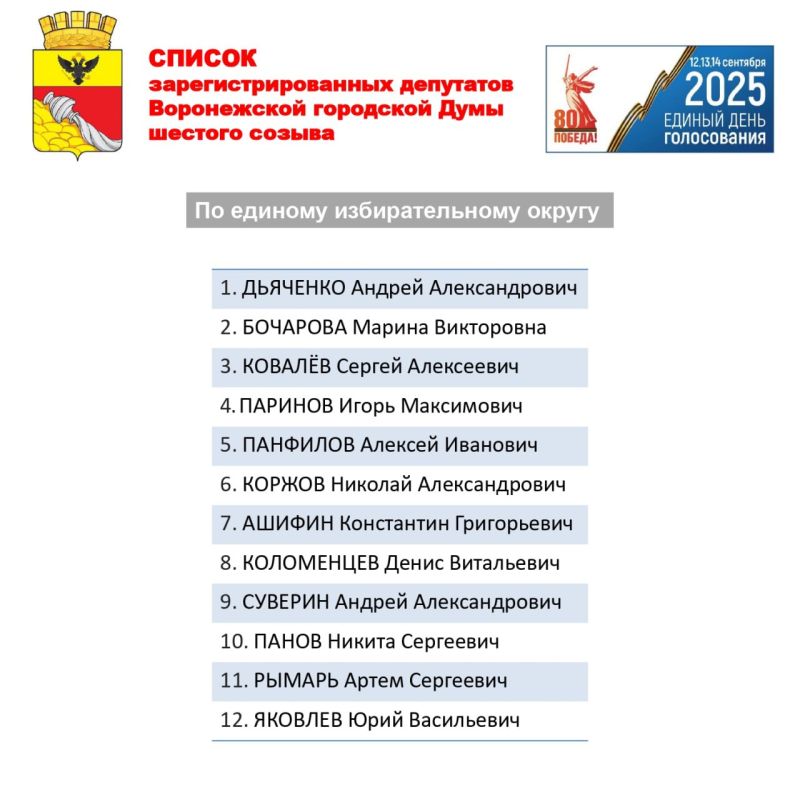 12 депутатов Воронежской городской Думы шестого созыва, избранные по единому избирательному округу, зарегистрированы ТИК Ленинского района г. Воронежа.24 депутата Воронежской городской Думы шестого созыва, избранные...