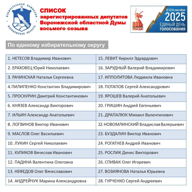Сегодня на заседании облизбиркома принято решение о регистрации 28 депутатов Воронежской областной Думы восьмого созыва, избранных по единому избирательному округу.Еще 28 депутатов регионального парламента, избранных по одномандатным избирательным...