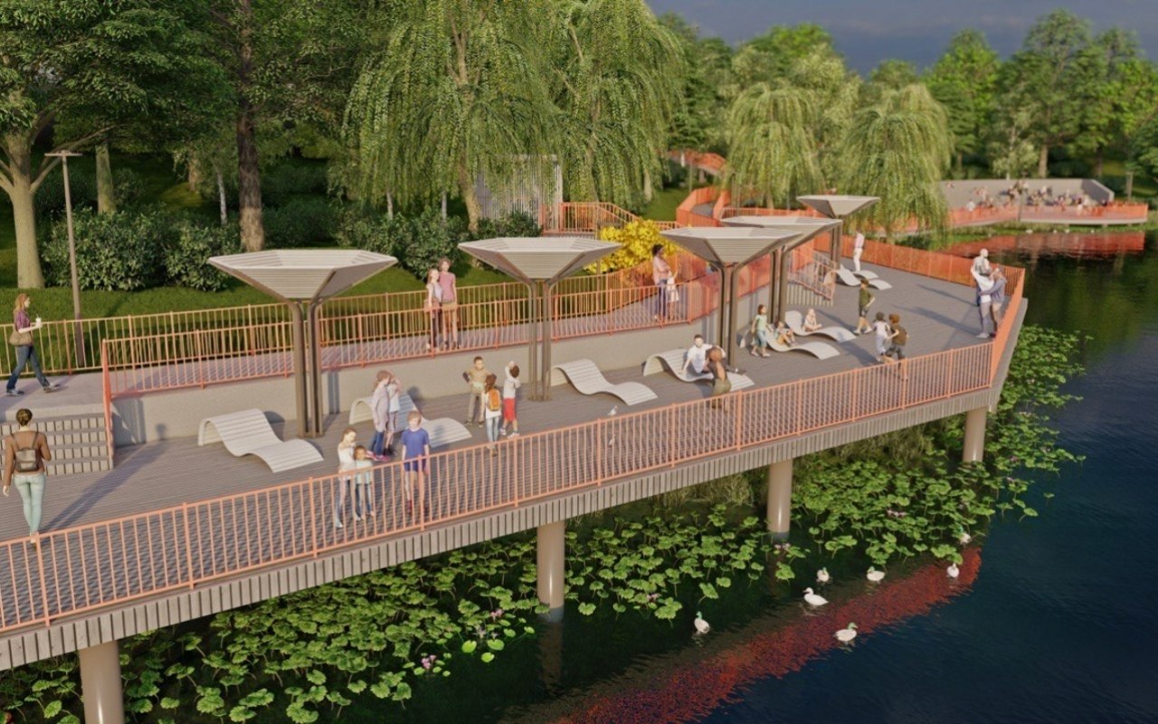 Работы нужно завершить до 1 октября 2026 года. В проект входят амфитеатр со сценой у воды, фотозона, закрытая детская площадка, дорожки с пандусами, места для отдыха, пирс и другие элементы современного общественного пространства.