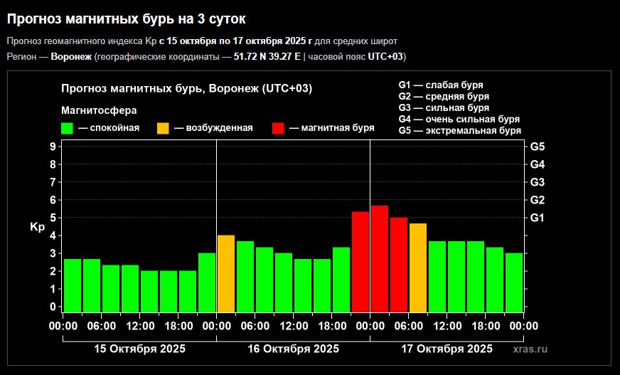 Геомагнитная активность резко возрастет в районе полуночи и будет сохраняться вплоть до 6:00, после чего пойдет на спад.