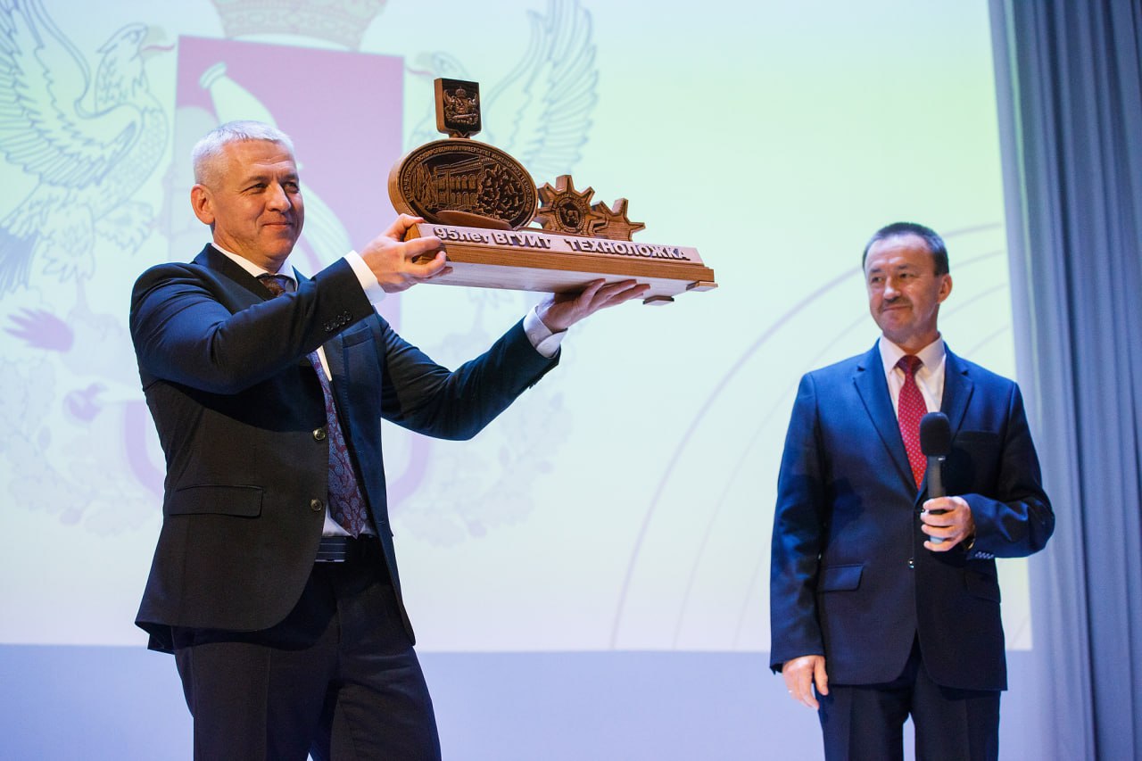 Юрий Матузов вручил награды регионального парламента сотрудникам и ветеранам вуза, а ректору ВГУИТ Николаю Репникову передал оригинальный деревянный сувенир ручной работы с изображением исторического здания университета.