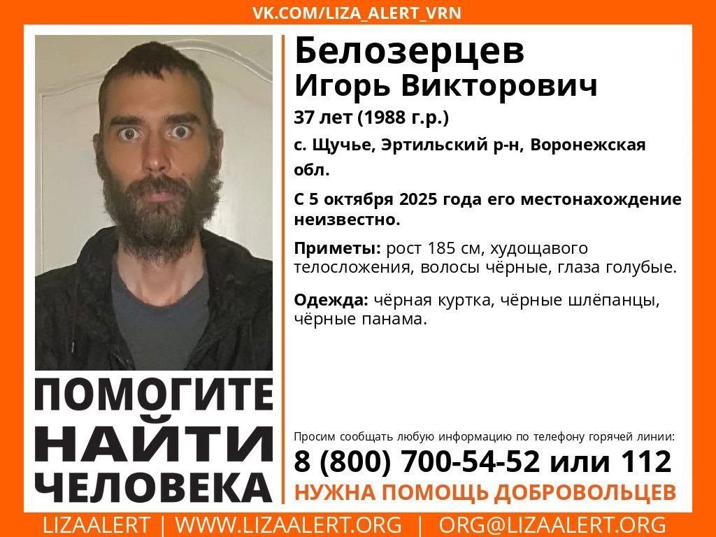 Как сообщили корреспонденту «Обозреватель.Врн» добровольцы, 37-летний мужчина вышел из дома в неизвестном направлении. Ранее проживал с родными. О местонахождении Игоря Белозерцева из села Щучье ничего неизвестно с 5 октября.