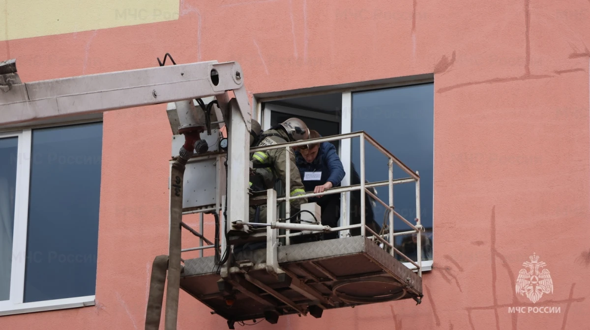 Фото — пресс-служба ГУ МЧС по Воронежской областиПо легенде учений, на четвертом этаже произошел пожар, сработали системы пожарной сигнализации и оповещения, началась эвакуация, но несколько человек оказались отрезанными огнем. Спасателям необходимо было потушить возгорание, при помощи масок спасаемых, раздвижных трехколенных лестниц и высотной техники вывести людей из здания.