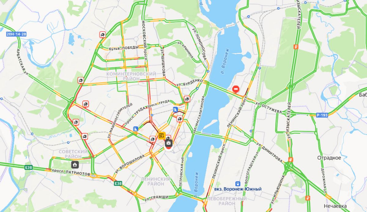 Сегодня повезло тем воронежцам, которые успели быстро добраться домой с работы. А вот тем, кто только что вышел с рабочего места, предстоит очень долгий путь. Об этом свидетельствуют данные сервиса "Яндекс Карты".
