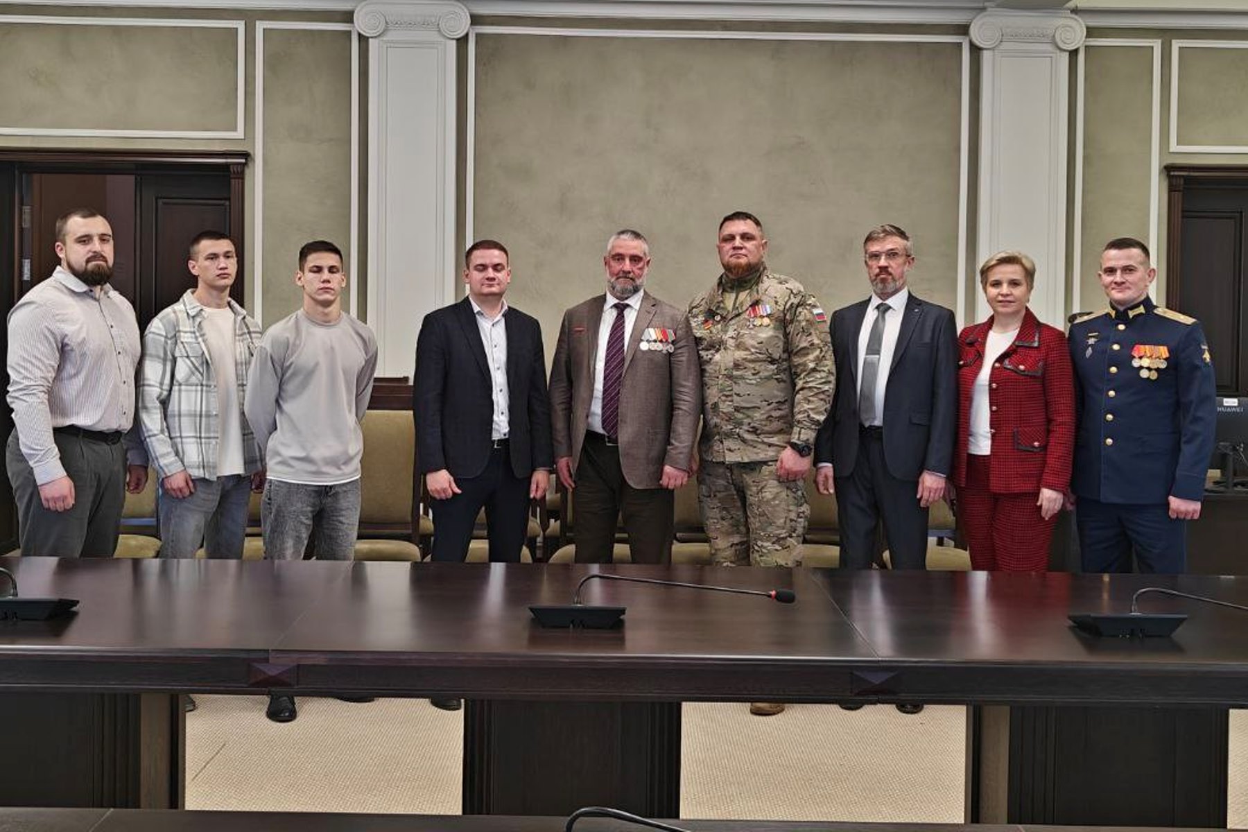 На встречу со студентами пришли участники спец операции - депутат Воронежской областной Думы Денис Рубащенко, депутат городской Думы Михаил Гамбург, а также Илья Полуян и Сергей Олейников.