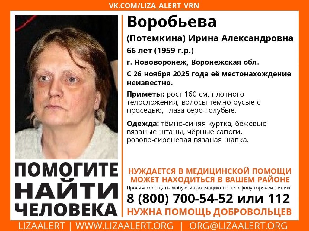 Требуется помощь в поисках 66-летннй Ирины Воробьевой из Нововоронежа. Пенсионерка не выходит на связь с семьей со среды, 26 ноября. Известно, что женщина нуждается в медицинской помощи – ранее она никогда не пропадала.