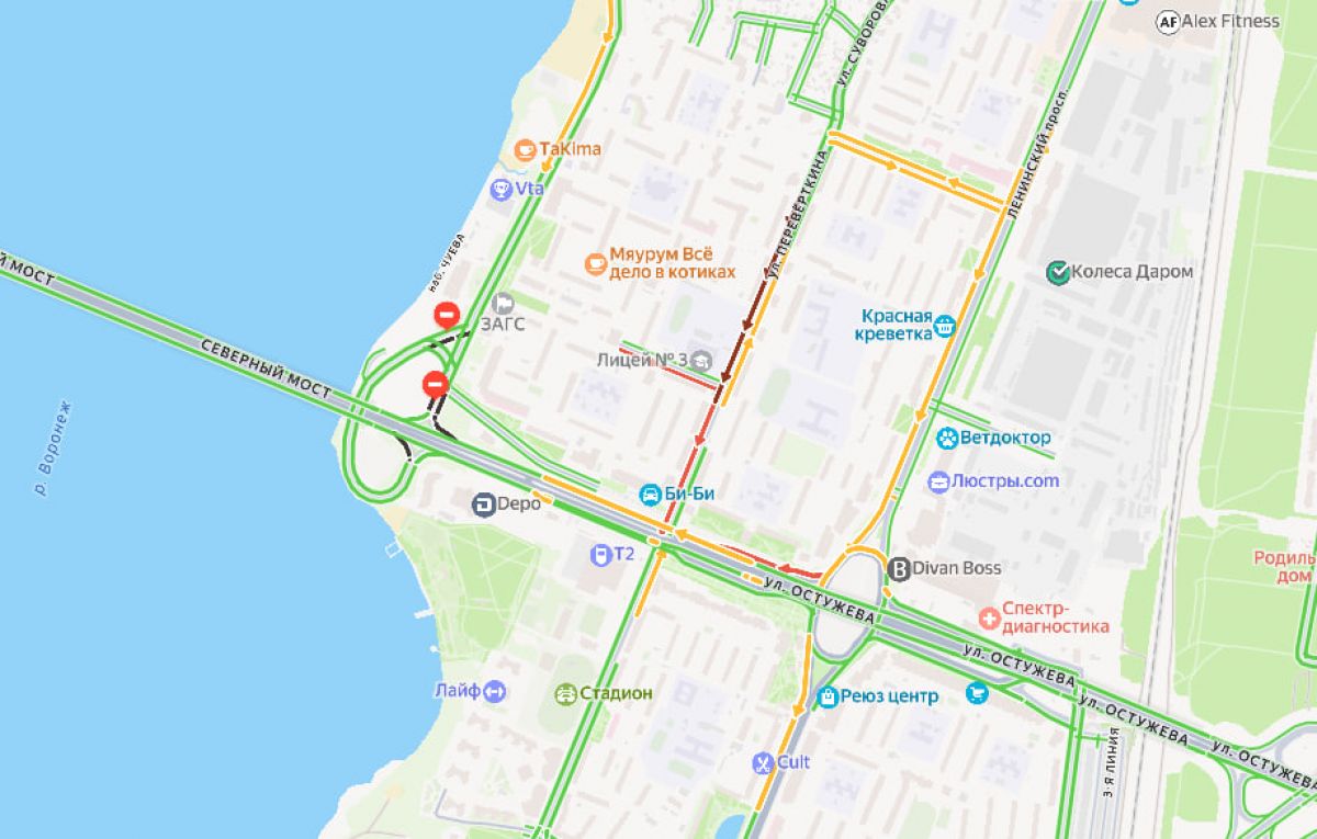 Жители Левобережного района Воронежа, чей путь на работу пролегает через Северный мост, встали утром в жуткой пробке. В социальных сетях горожане сообщают, что автомобили намертво стоят на Остужева и Переверткина, также заторы наблюдаются на Ленинском проспекте.