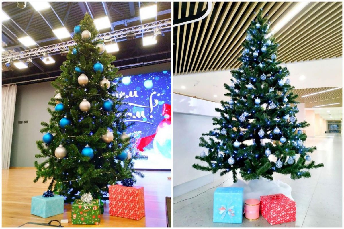 И вот просторный холл и актовый зал новой школы украсили два величественных символа новогодних торжеств, и будут радовать учащихся своим великолепным убранством и наполнять сердца праздничным настроением.