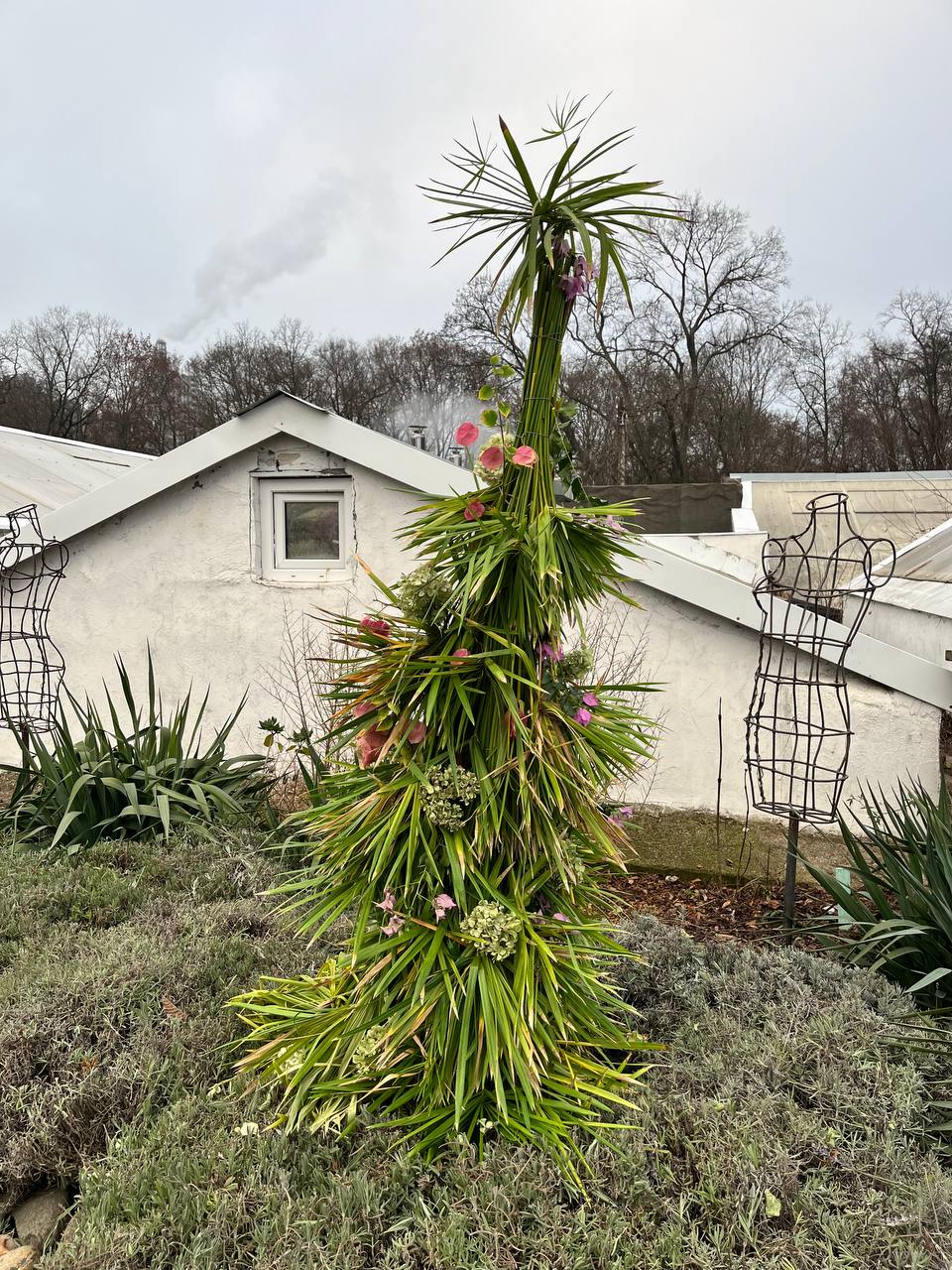 Сотрудники сада прикрепили обрезки циперуса к деревянной основе. Сверху припорошили цветками гортензии и бугенвиллеи.