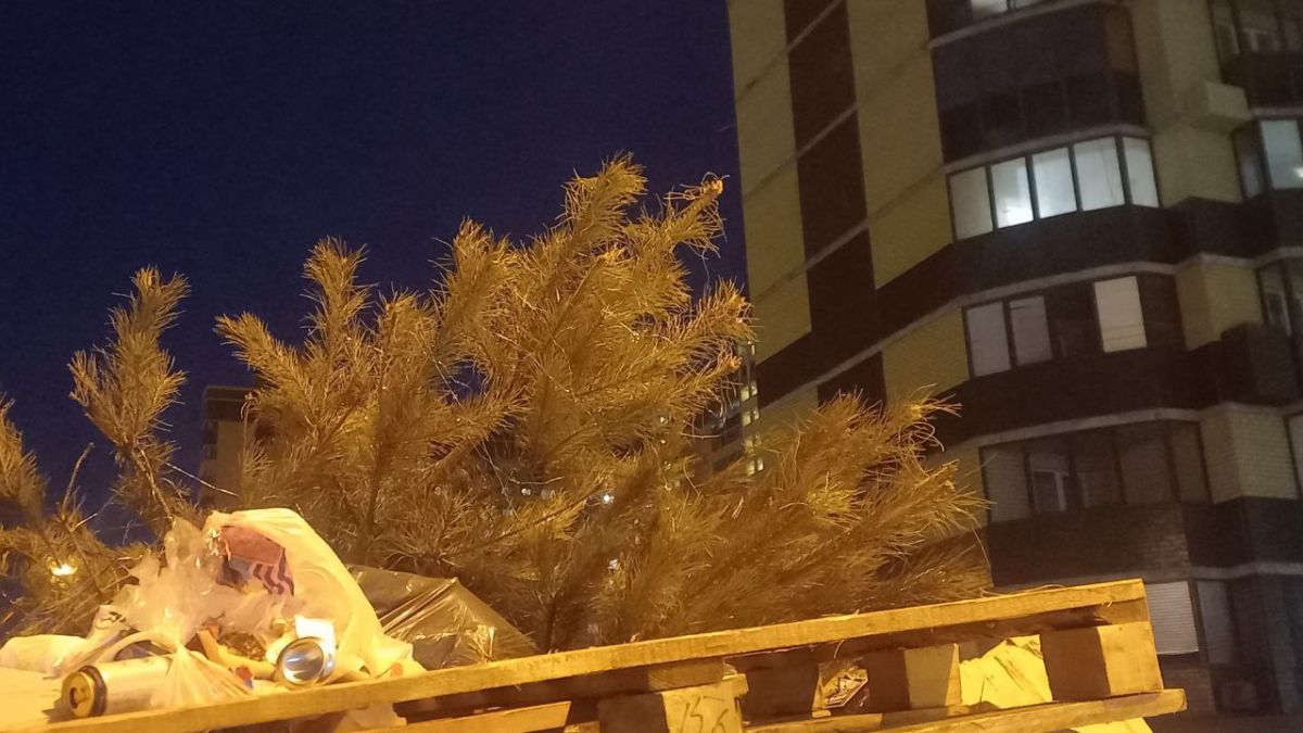 Ёлки, ещё недавно радовавшие своими огнями и ароматом, теперь скромно ждут утилизации у мусорных контейнеров, на детских площадках и прямо на тротуарах. В подъездах и лифтах многоквартирных домов на полу лежит хвойный ковёр из осыпавшейся хвои, который тянется от квартир до мусорок.