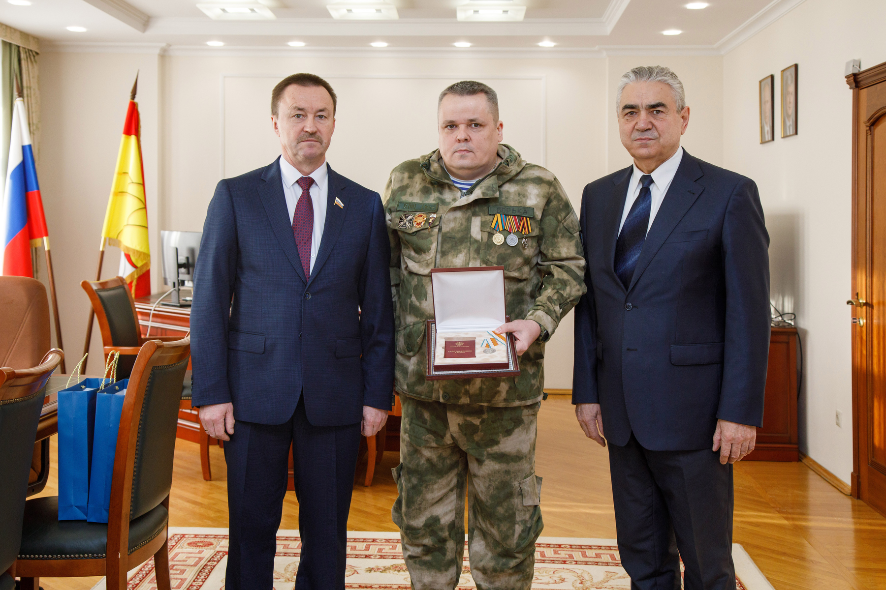 Председатель облдумы вручил медаль и пожелал герою СВО крепкого здоровья и благополучия.