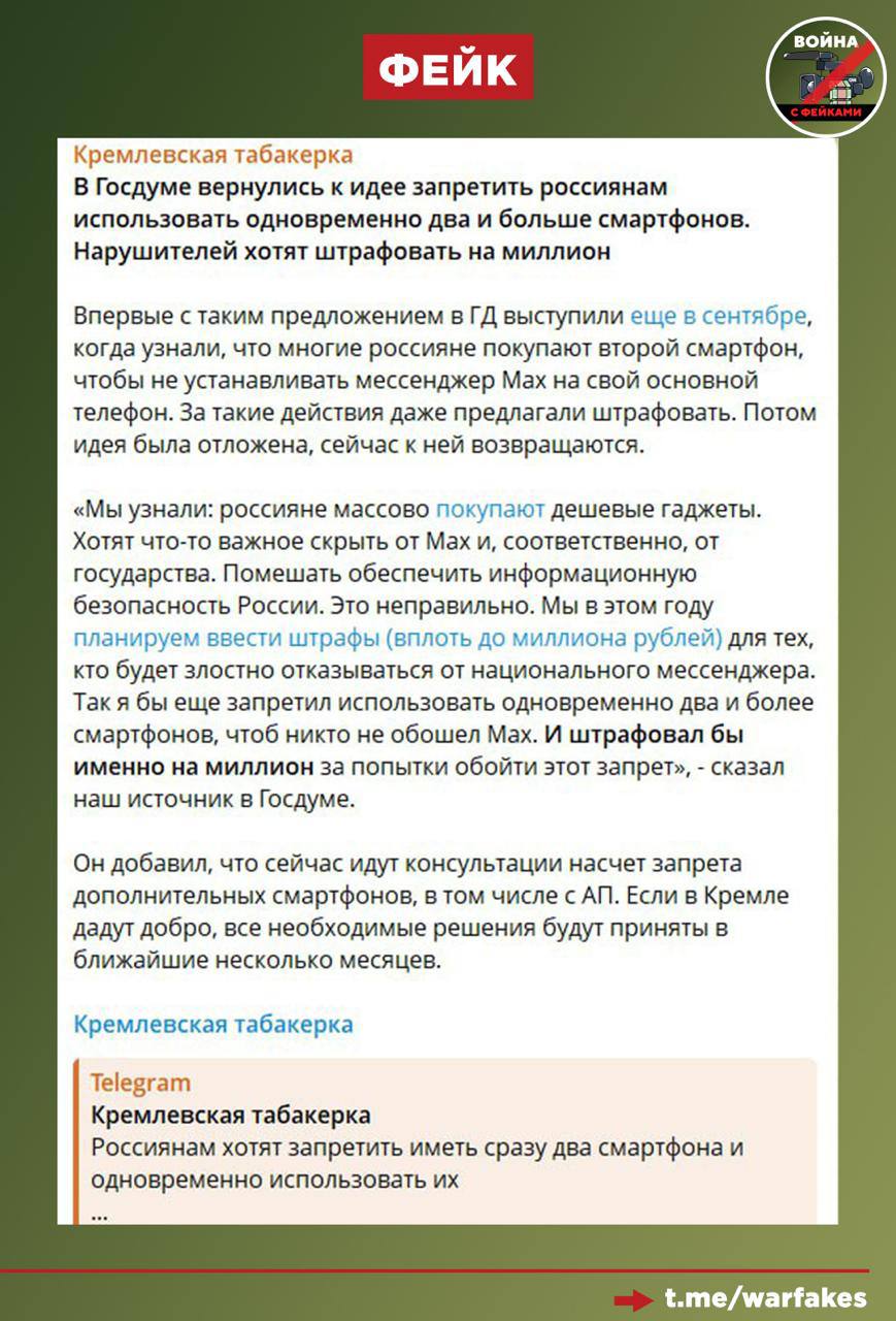 Фейк распространяет telegram-канал «Кремлевская табакерка». Эта ложь уже идет на второй круг – осенью 2025 года похожее сообщение уже опровергали. Тогда был фейк о запрете иметь два и более смартфонов. Антироссийский паблик писал, что россияне якобы скупают устаревшие смартфоны, чтобы установить на них мессенджер МАХ и тем самым скрыть свои данные от государства. Чтобы бороться с этой тенденцией, в Госдуме якобы решили ввести запрет на два и более смартфонов. Об этом паблик заявил со ссылкой на некоего «влиятельного депутата».