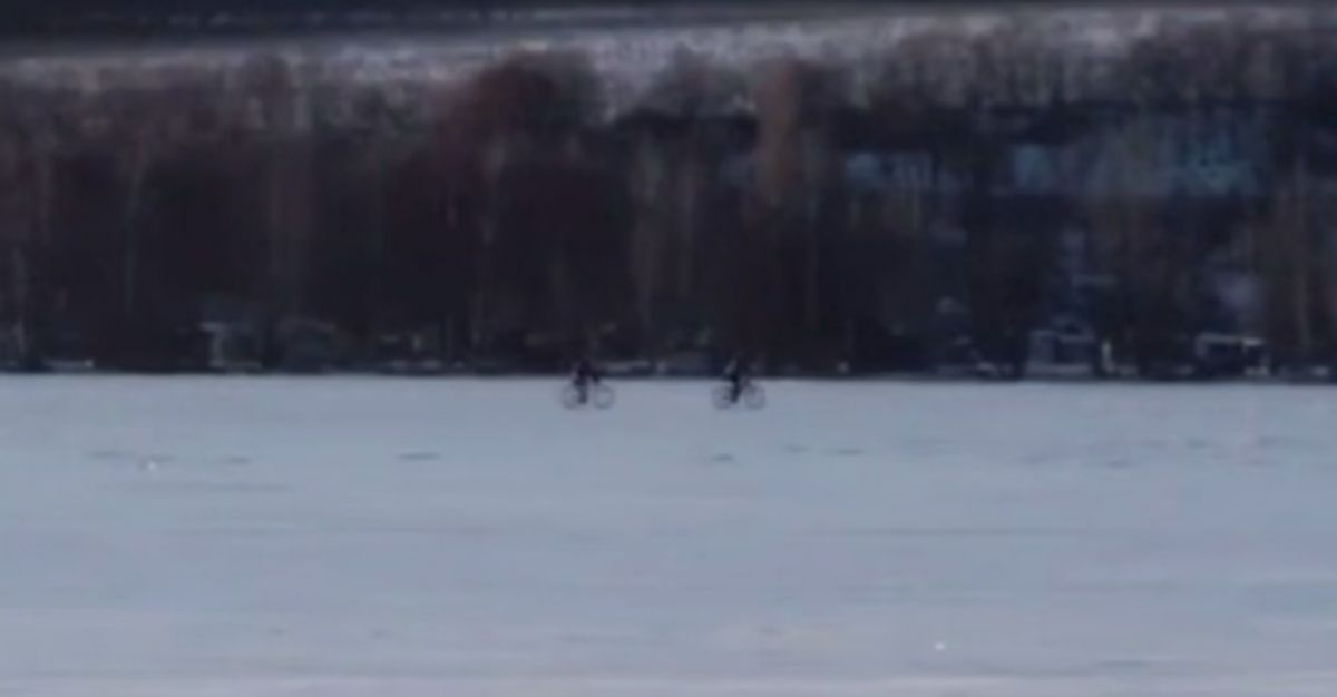 Кадры показывают, как мужчины спокойно крутят педали и неспешно двигаются вдоль одного из берегов. Возможность для такой экстремальной прогулки предоставила погода. Сильные морозы, установившиеся в регионе после новогодних праздников, сделали ледовый покров водоёма достаточно толстым и прочным, чтобы выдержать вес человека и велосипеда.
