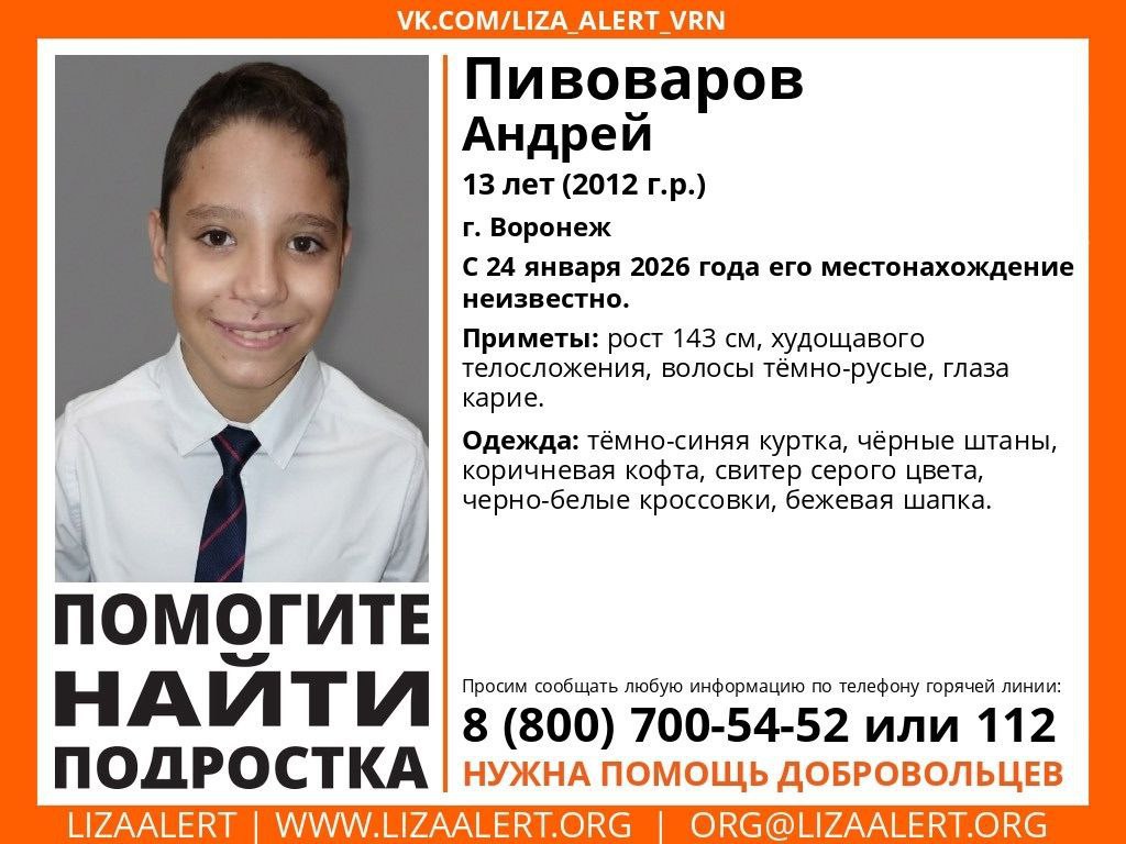 Волонтеры открыли поиски 13-летнего Андрея Пивоварова. Мальчик 24 января вышел из дома на прогулку и перестал выходить на связь с родственниками. Уже сутки о его местонахождении ничего неизвестно.