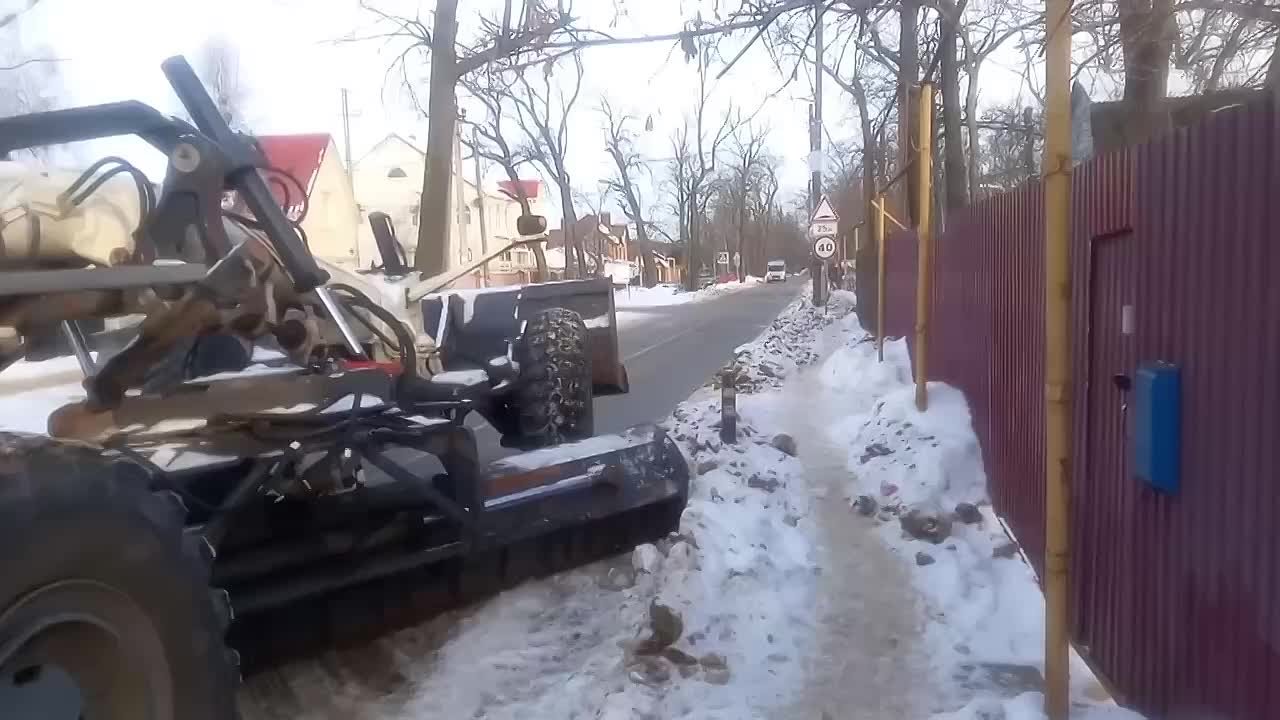 На улице Дубовой снег, который скопился на обочине, убирали механизировано. Для этого грейдером предварительно формировали снежный вал, после чего его собирали лаповым погрузчиком.