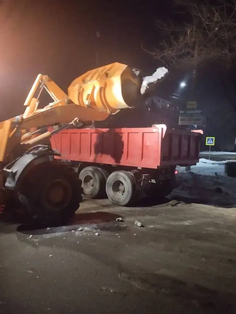 Ночью уборка городских территорий продолжалась. Работали 154 единицы техники, было использовано около 900 тонн пескосмеси и больше 1,6 тысяч кубометров снега.