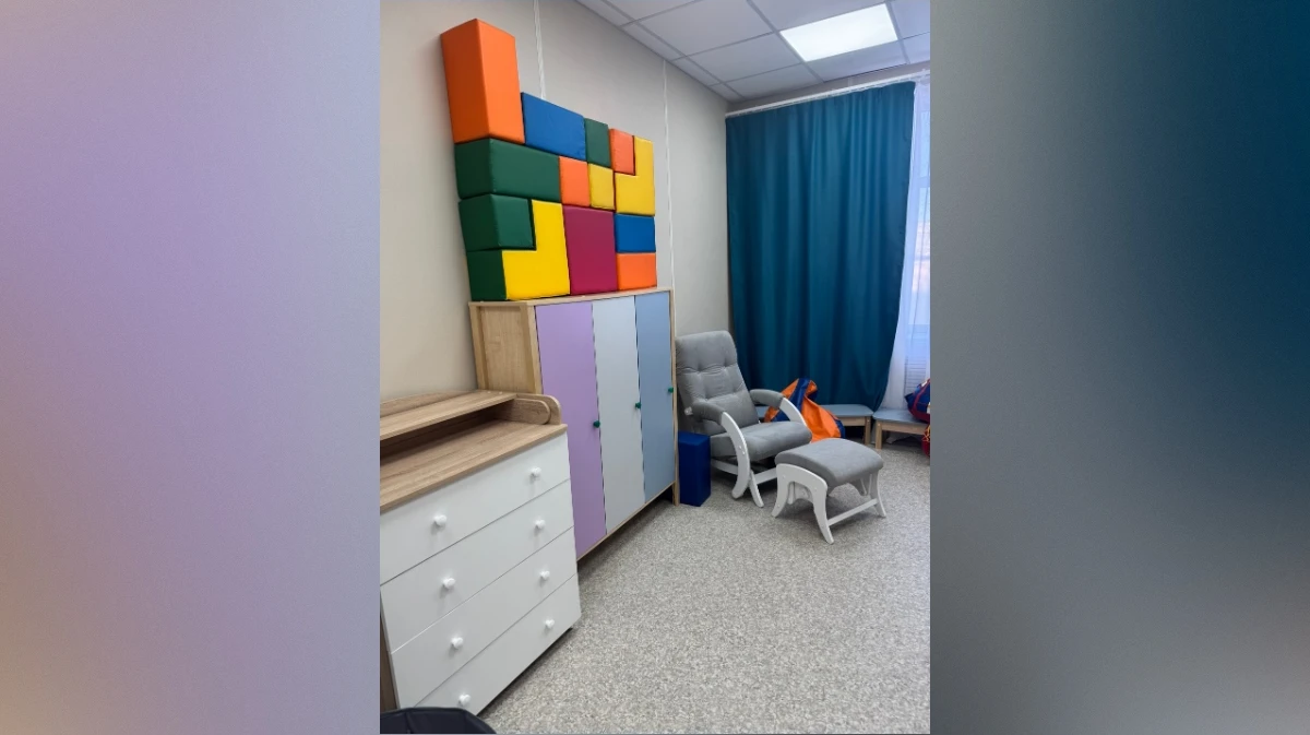 В комнате матери и ребенка оборудовали игровую, гигиеническую, кухонную зоны, а также есть зона для кормления и пеленания. Пространство открыто с понедельника по пятницу с 9:00 до 16:30, перерыв с 12:00 до 12:30.
