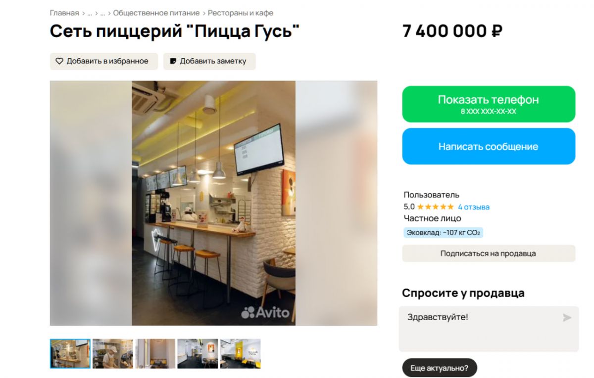 Известная воронежцам сеть пиццерий «Пицца Гусь» ищет нового владельца. Весь бизнес, включающий три точки, бренд и технологическое оборудование, выставлен на продажу на популярной интернет-площадке Avito. Общая стоимость предложения составляет 7 миллионов 400 тысяч рублей.