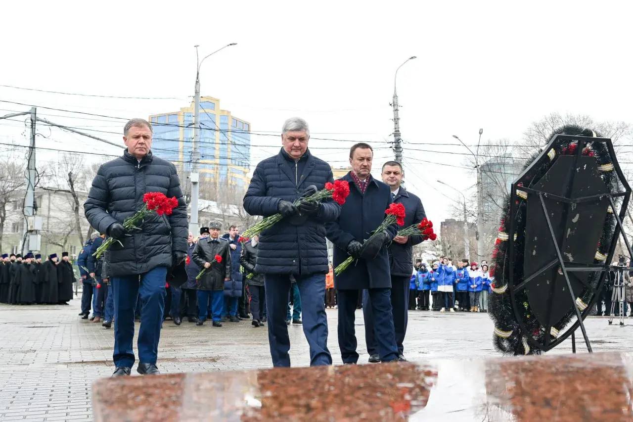 Участники возложили венки и цветы к памятнику «Воронежцам воинам-интернационалистам – участникам локальных войн и военных конфликтов». Священнослужители Воронежской епархии провели у памятной стелы траурную панихиду. В завершение церемонии военный оркестр исполнил гимн Российской Федерации, а почетный караул прошел торжественным маршем.