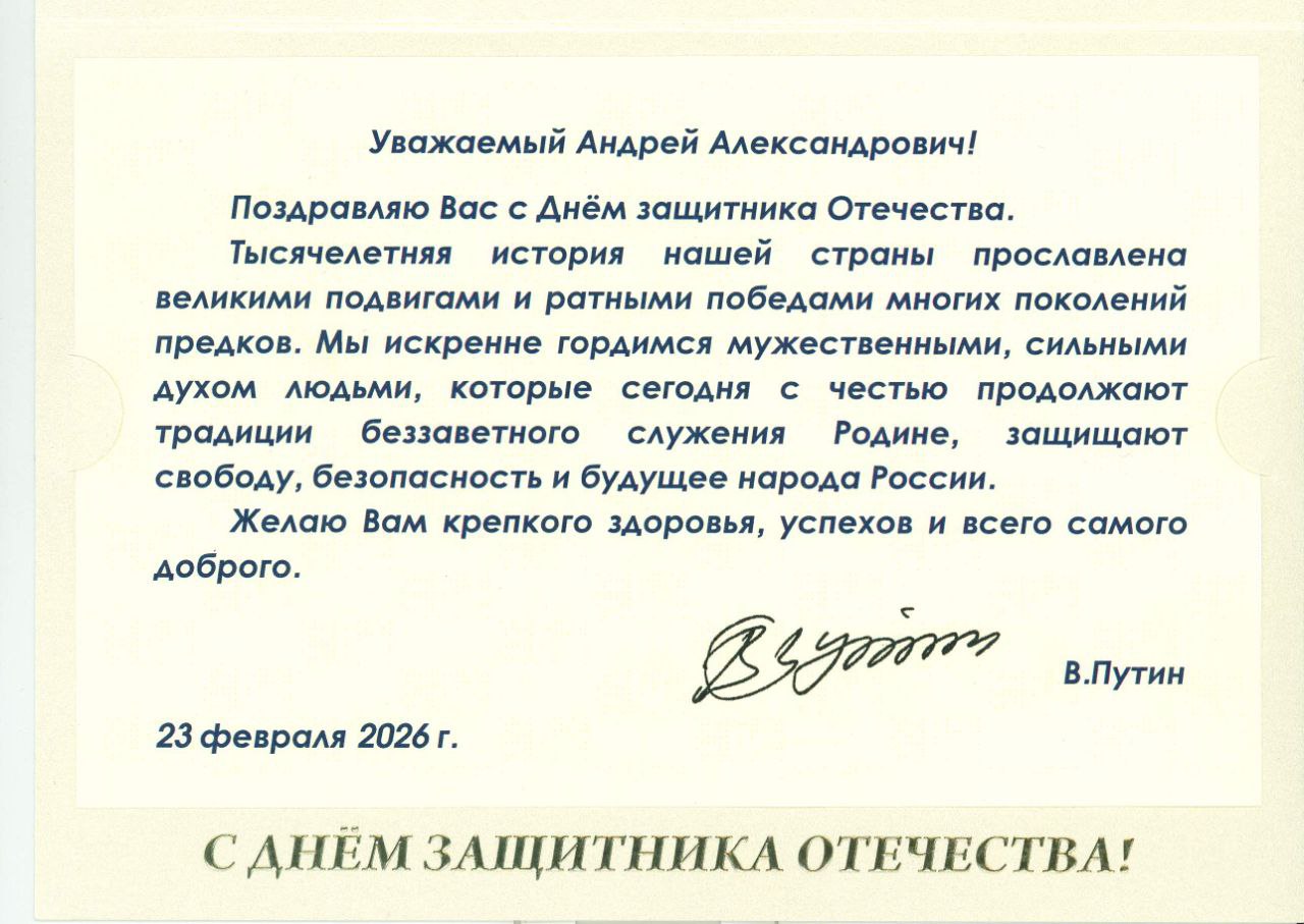 Президент России Владимир Владимирович Путин направил поздравление с Днём защитника Отечества председателю Воронежской городской Думы, Герою России Андрею Александровичу Дьяченко.