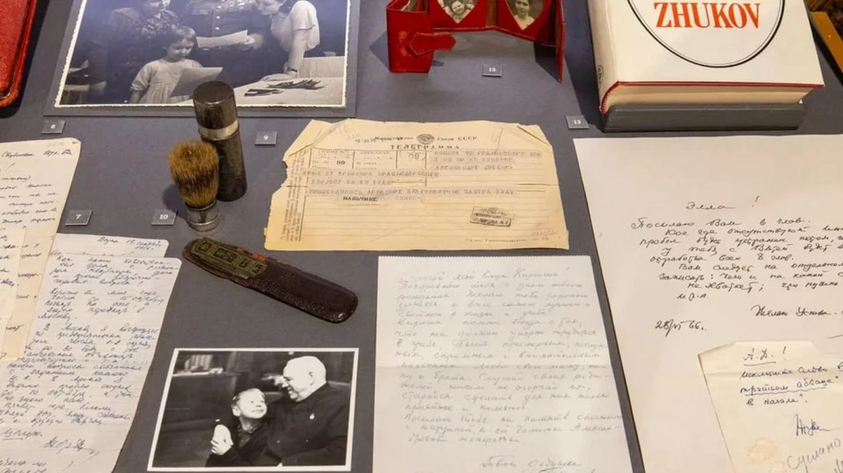 Посетители выставки впервые увидят предметы гражданского и военного быта, письма и поздравительные открытки Георгия Жукова членам семьи и друзьям, мемуары, фотопортреты, карманные и наручные часы, орденскую планку, рабочую папку маршала.