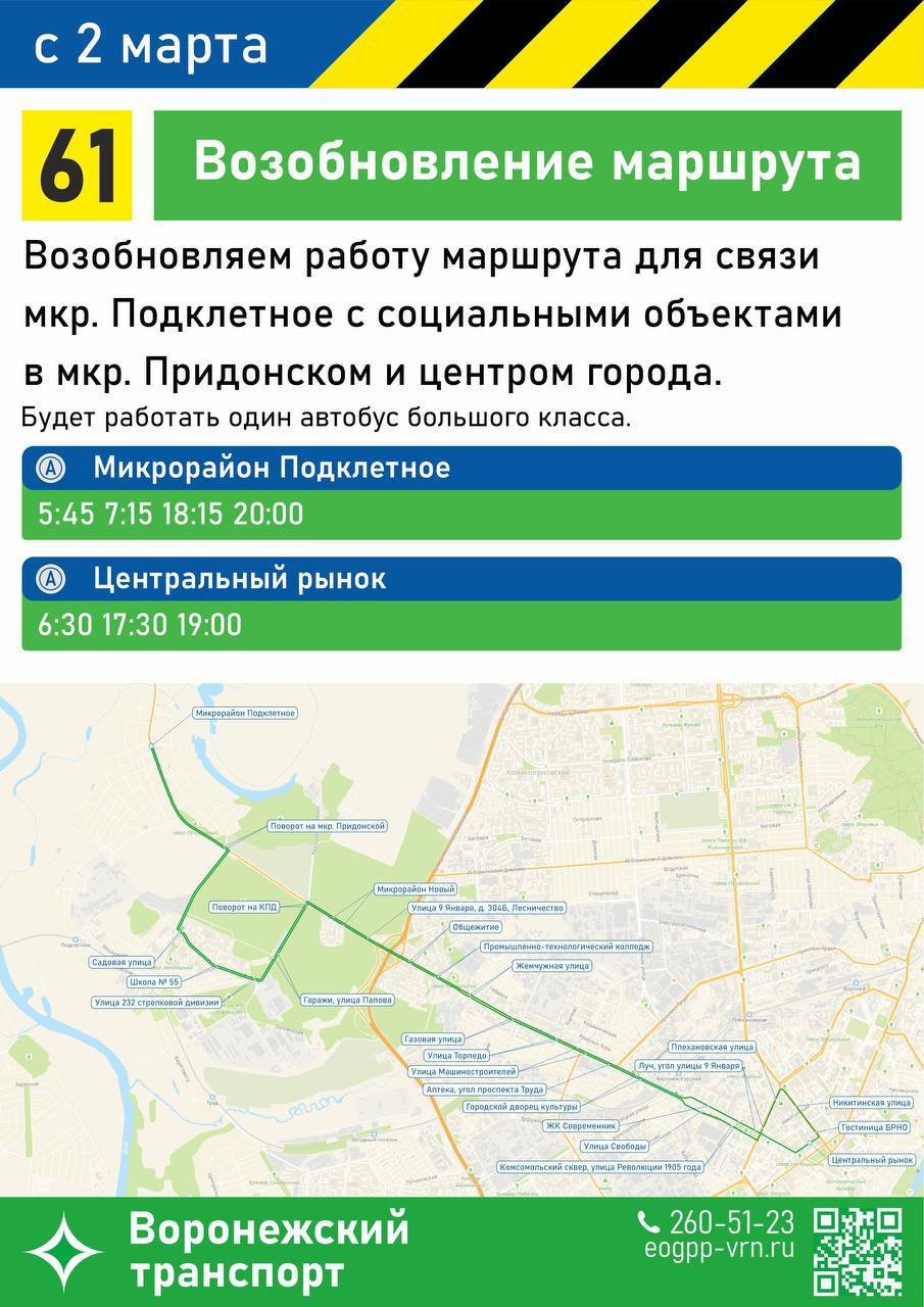Из микрорайона Подклетное автобус будет следовать в микрорайон Придонской, оттуда – в центр города по улицам 9 Января, Свободы, Кольцовской, Плехановской, Пушкинской. Затем подвижной состав вернется на улицу 9 Января и проследует в обратном направлении.