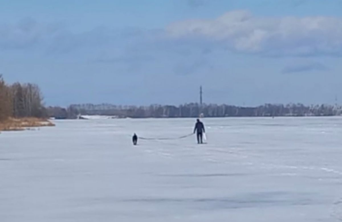 Пока одни сверлят лунки, другие используют водоём как пешеходную зону. Очевидцы заметили мужчину, который вышел на лёд вместе с собакой. Вместо того чтобы идти по берегу, горожанин выбрал короткий путь прямо по замерзшей воде, уводя питомца куда-то вдаль.