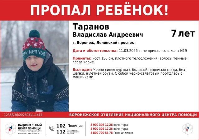 Всех, кто владеет информацией о местонахождении Владислава Таранова или видел похожего по описанию мальчика, просят сообщить по телефону 8-800-700-56-76.