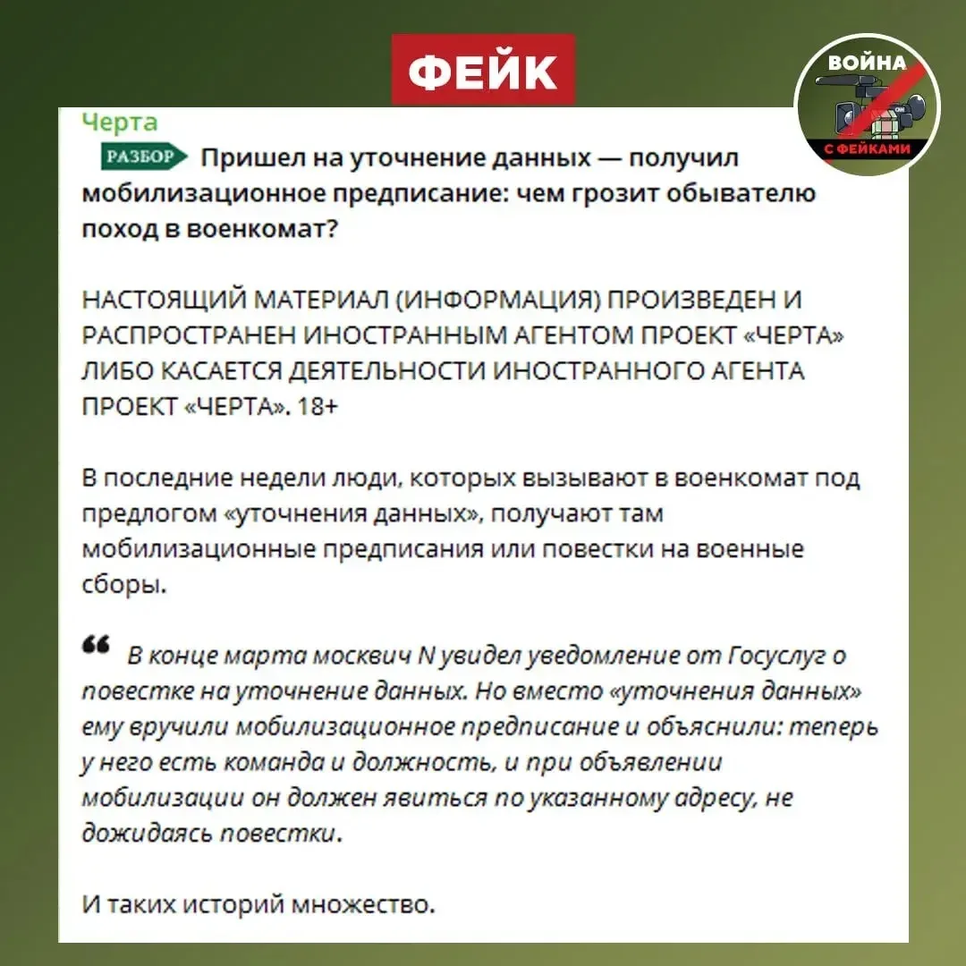 На самом деле в рамках цифровизации системы военного учета граждан вызывают в военные комиссариаты для уточнения персональных данных. Распространители фейка пытаются выдать стандартную процедуру по актуализации базы данных военкоматов за предпосылки начала новой волны мобилизации.