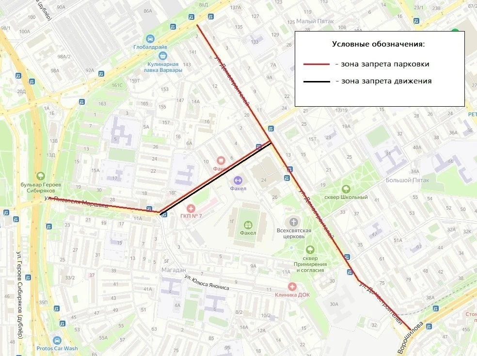 Остановка и парковка будет запрещена на участке улиц Домостроителей и Писателя Маршака с 18:00 вторника, 21 апреля, до 22:30 среды, 22 апреля. Полностью закроют движение по улице Писателя Маршака 22 апреля с 12:00 до 22:30.