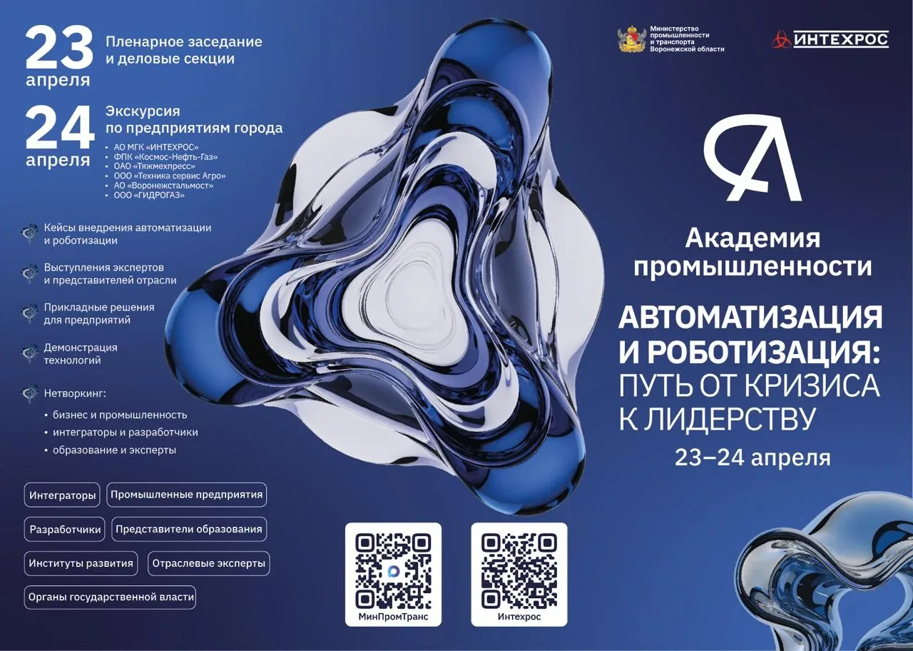 23 апреля в Воронеже состоится конференция «Академия промышленности». В центре внимания – вопросы автоматизации и роботизации как стратегического ответа на вызовы кадрового дефицита и необходимости повышения производительности труда.