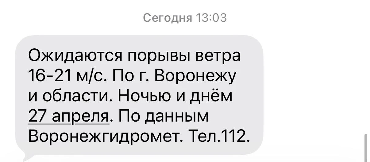 Ночью и днём 27 апреля местами по г. Воронежу области ожидаются порывы ветра 16-21 м/с.МЧС России напоминает:выбирай одежду и обувь по погоде;соблюдай скоростной режим и дистанцию на автомобиле;переходя проезжую часть, убедись, что...