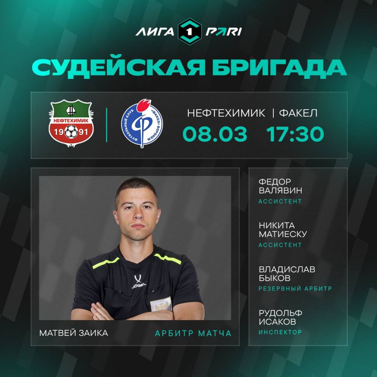 Назначение на этот матч получила судейская бригада во главе с арбитром Матвеем Заикой. Помогать ему будут ассистенты Федор Валявин и Никита Матиеску. Резервным судьей выступит Владислав Быков, инспектором матча назначен Рудольф Исаков.