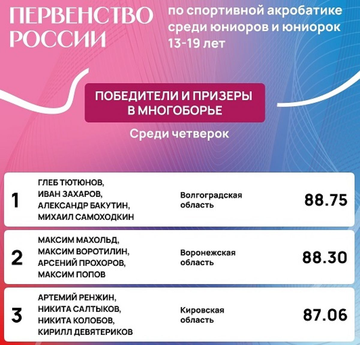 Напомним, что на недавно завершившемся Первенстве страны в Нижнем Новгороде среди спортсменов 12-18 лет воронежские спортивные акробаты завоевали несколько комплектов наград.